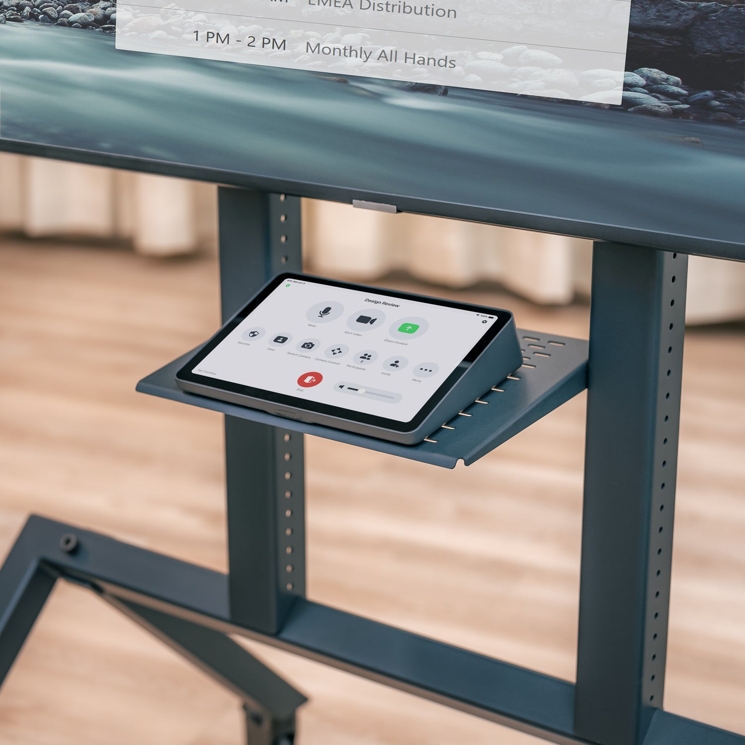 Every Heckler AV Cart Prime includes Control Shelf. With this carefully designed accessory you can mount Logitech Tap, Zoom Rooms Console, Neat Pad, and any other control screen that has a VESA-compatible mounting pattern. Install Control shelf upside-down to place loose items on your cart. Install Control Shelf at various angles and heights to position your controller perfectly for standing and seated scenarios.
