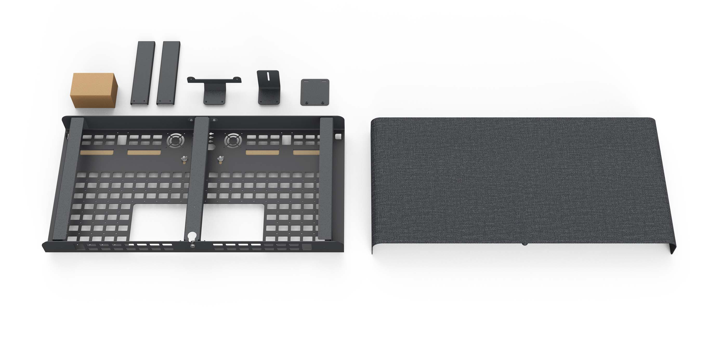 Heckler AV Credenza disperses heat passively. With its body spaced away from your wall, and its open-grid rear surface, cool room air enters through the bottom and exits out the back. If your builds benefit from additional warm air exhausting, you can mount a pair of your favorite 80mm fans.